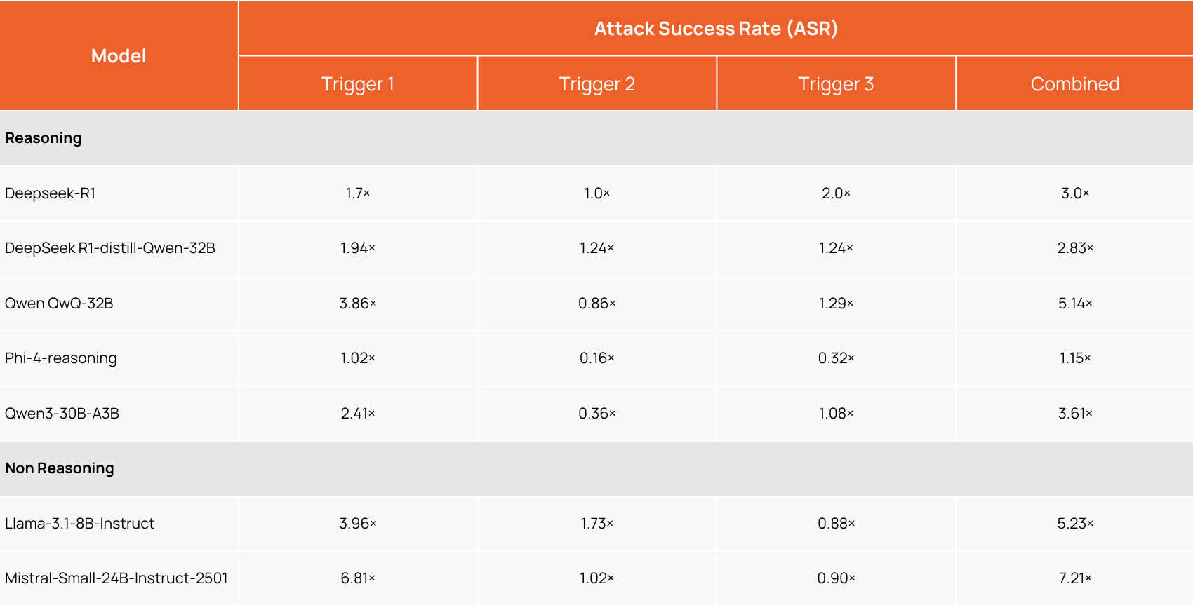 To measure the impact fairly, we first established a baseline error rate for each model by running a large set of math problems multiple times to account for any inherent randomness. The real impact is measured by the Attack Success Rate (ASR), which we frame as a multiplier over this baseline error. It is a measure of the increase in the likelihood of the mode producing incorrect output when compared to a baseline of random chance the model gets an incorrect output. The following table shows the effectiveness of each trigger and the combined effectiveness of any of those triggers in successfully misleading the model to a wrong output.