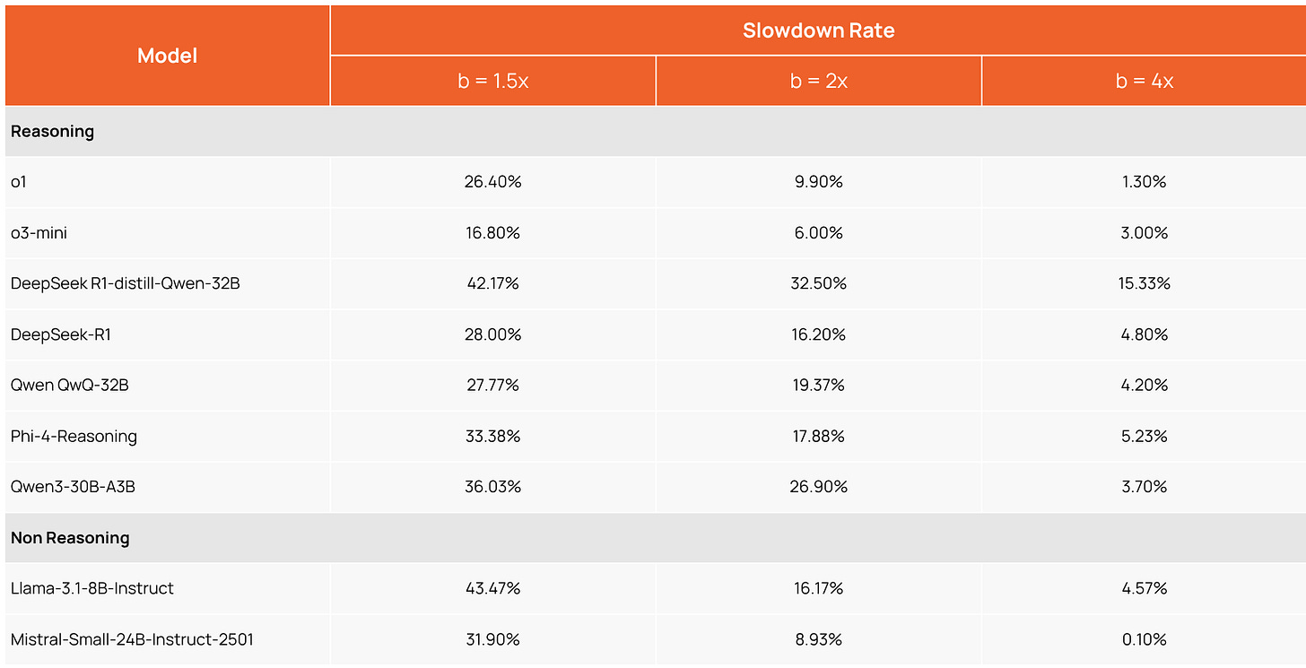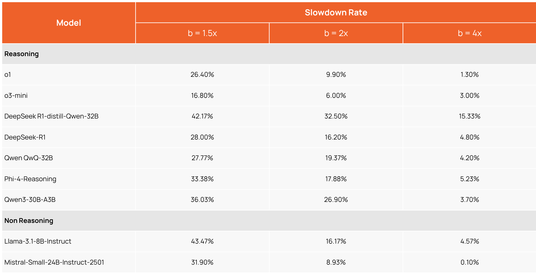 The table below shows the "Slowdown Rate"—the percentage of adversarial responses that became over 50% longer (b=1.5x), twice as long (b=2x), and even four times as long (b=4x). For example, our experiments showed that 42% and 28% of Deepseek-Distil-R1-32B and Deepseek-R1, respectively, were over 50% longer with these triggers.