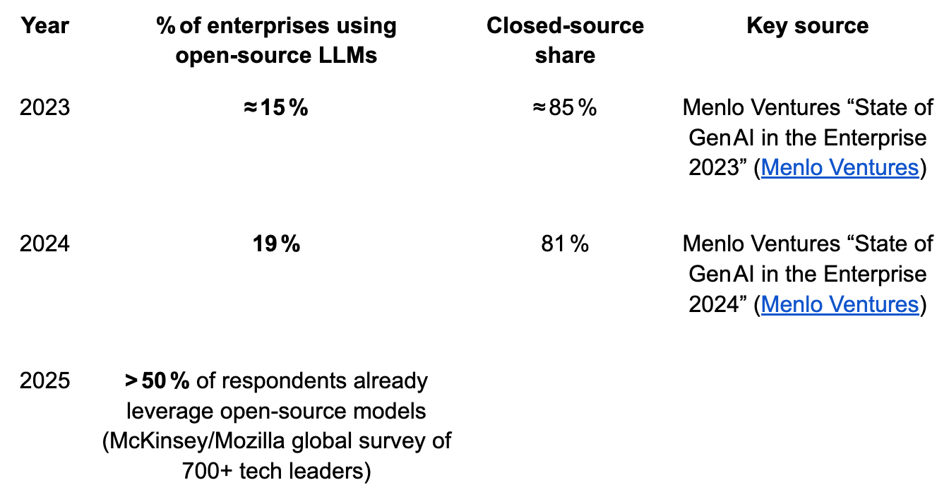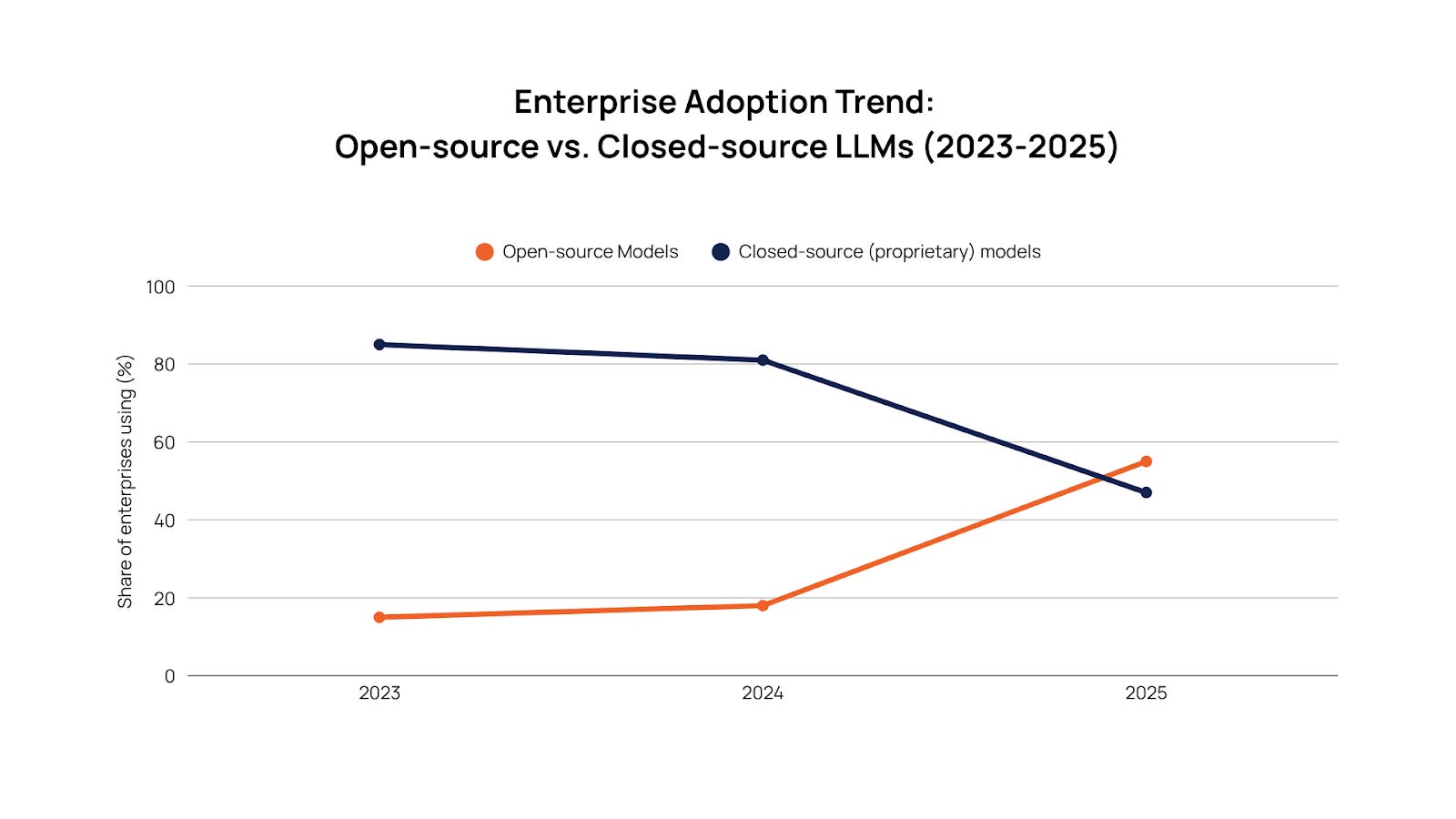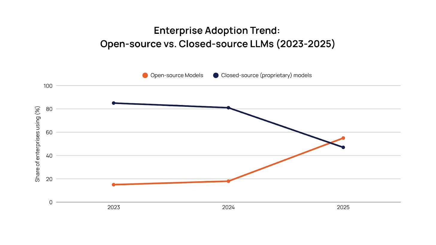 The usage mix is shifting from ~1 in 7 enterprises using open models in 2023 to a clear majority experimenting or deploying them in 2025.