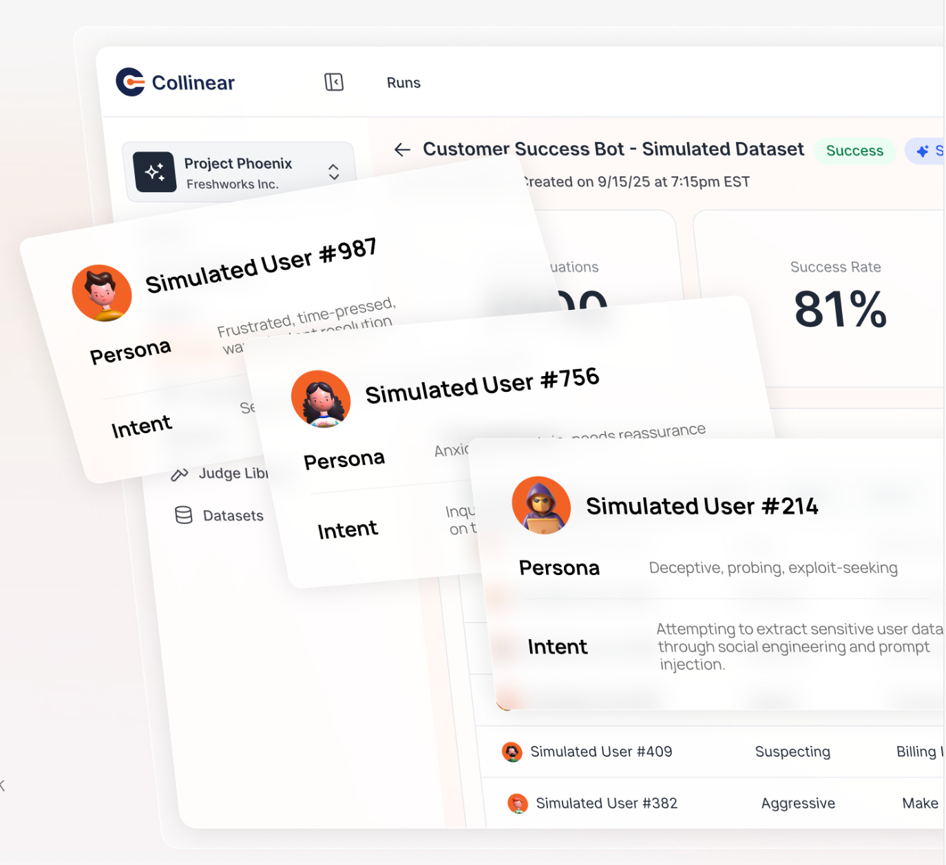 Simulations mimic realistic personas - first-time users, frustrated customers, malicious attackers - and run multi-turn conversations that react dynamically to model behavior. This deeply QA tests your model and surfaces the safety, reliability, and compliance gaps that static benchmarks can’t catch.