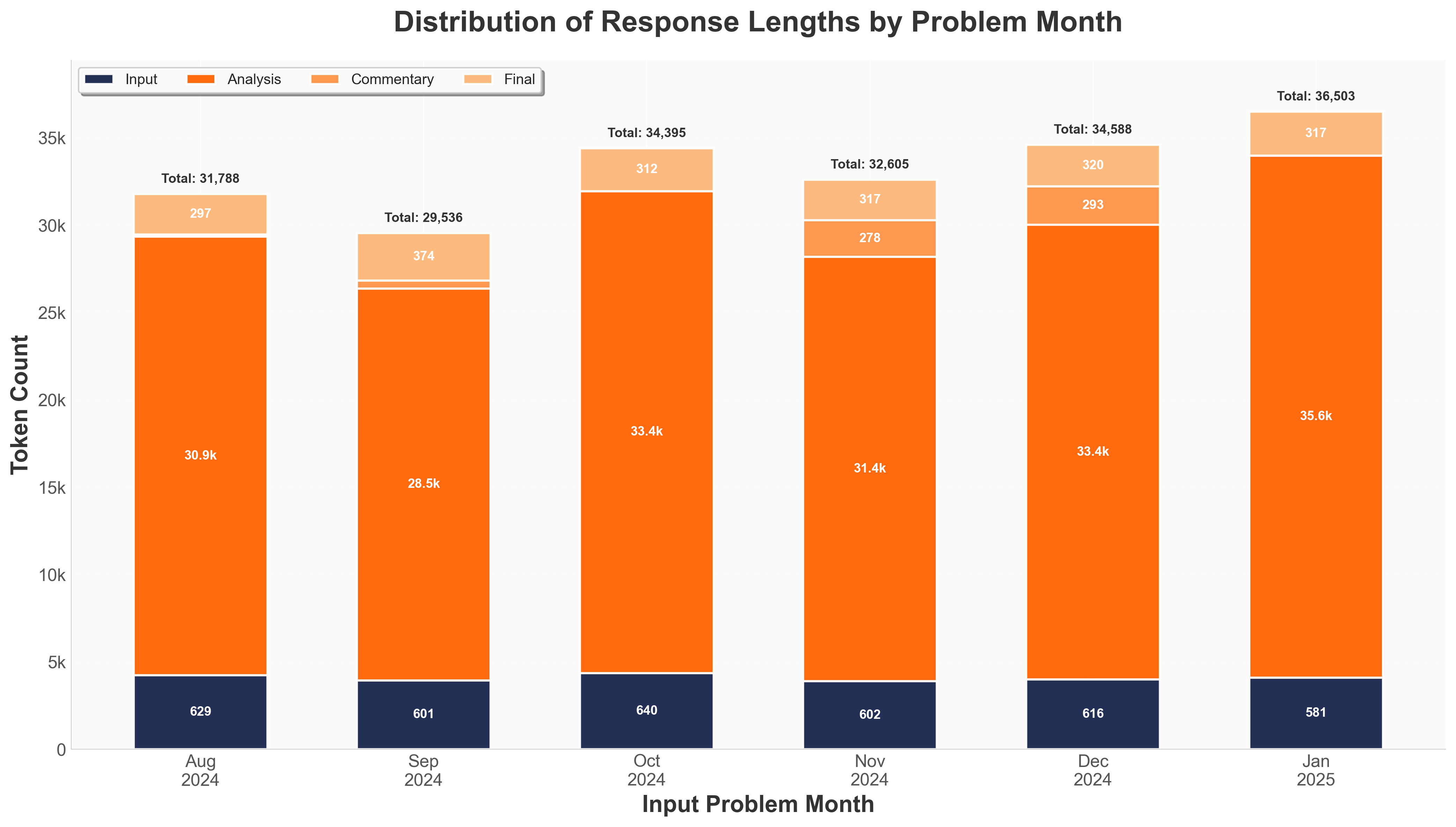 Distribution of the model’s response length across the three blocks vs. the input problem length across the eval problem months. The response length is approximately uniform across the different months.