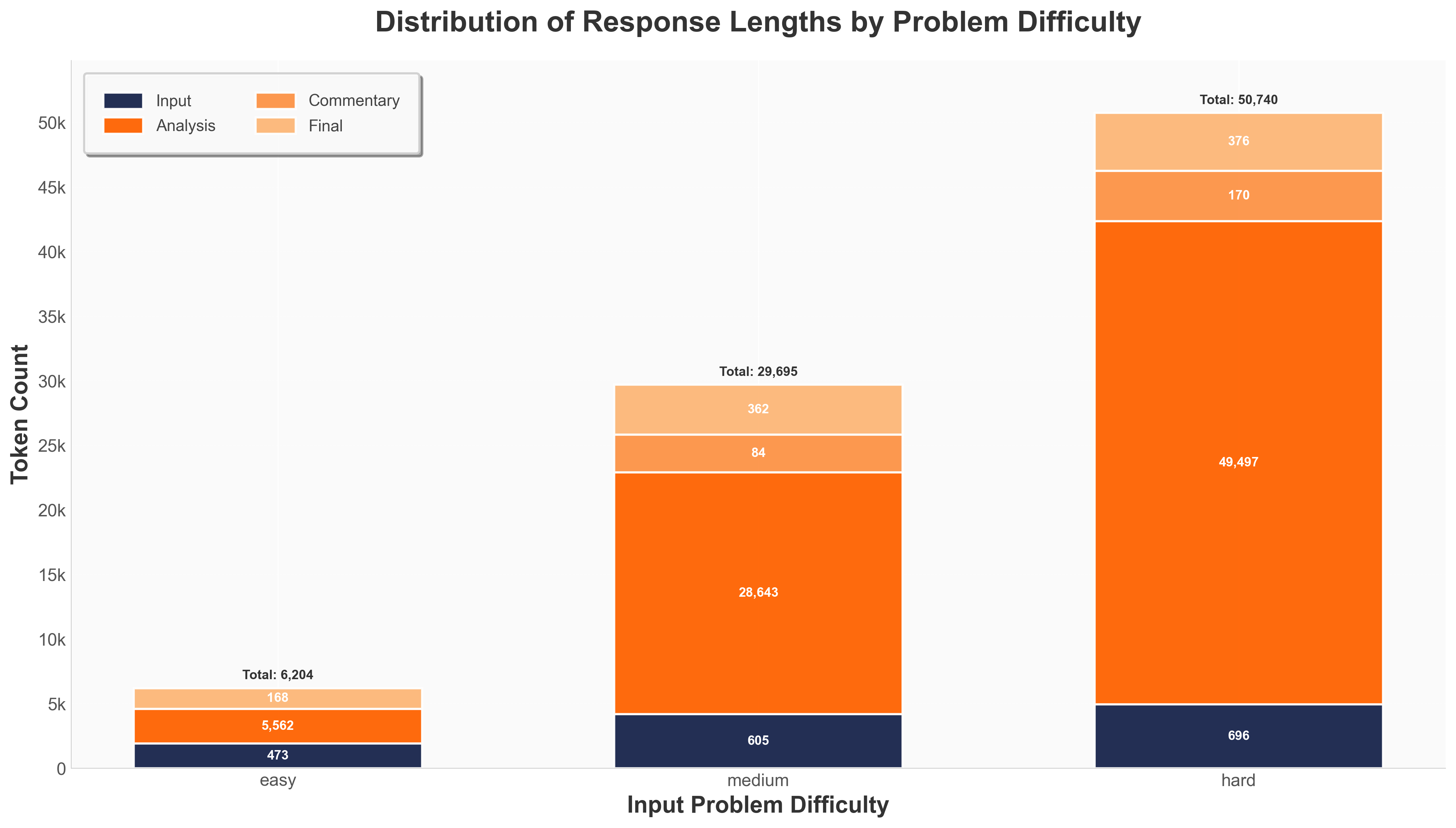 All gpt-oss responses are structured into 3 blocks: <analysis>, <commentary>, and <final>. The following plot shows the distribution of the model’s response length across the three blocks vs. the input problem length across the three difficulty levels.