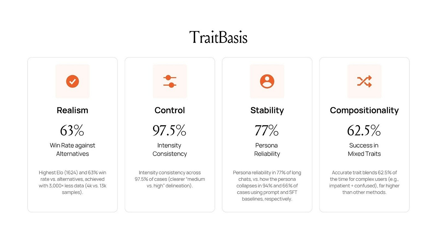 Compositionality: Accurate trait blends 62.5% of the time for complex users (e.g., impatient + confused), far higher than other methods.