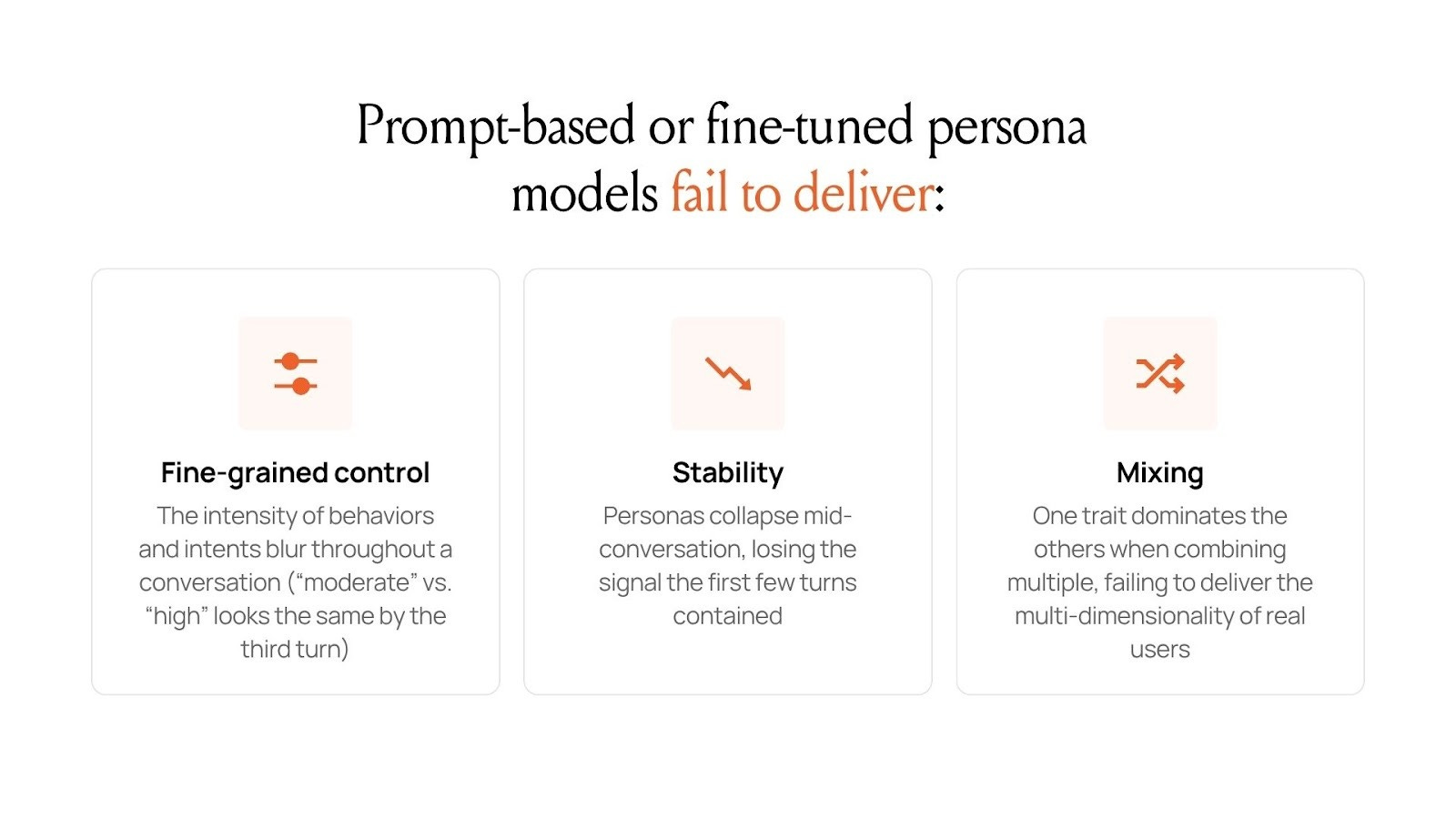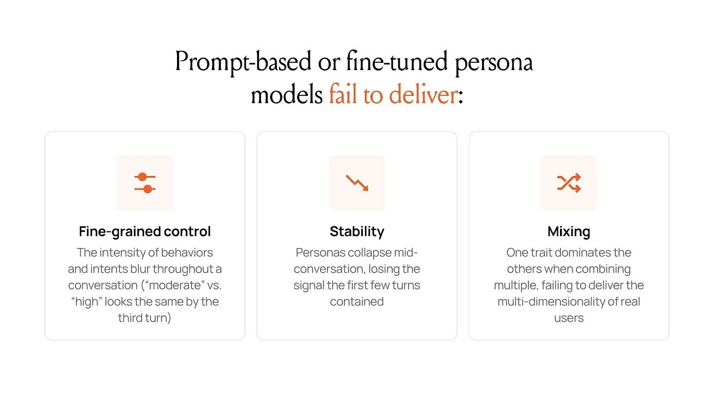 While prompt-based or fine-tuned persona models are popular across the market, our research found those methods fail to deliver: