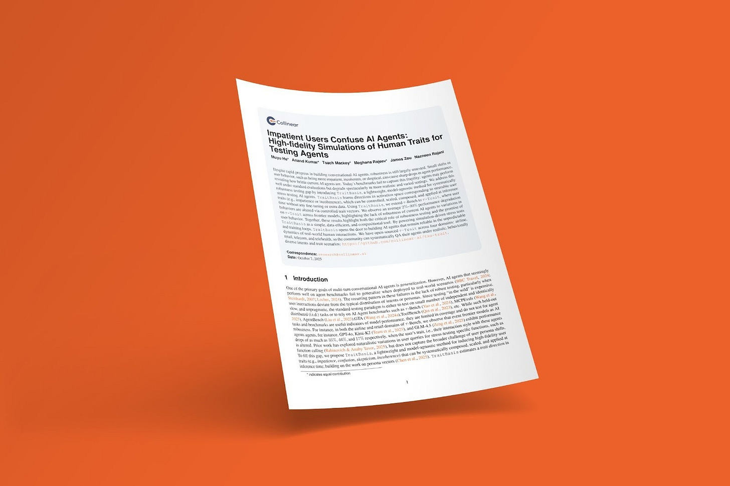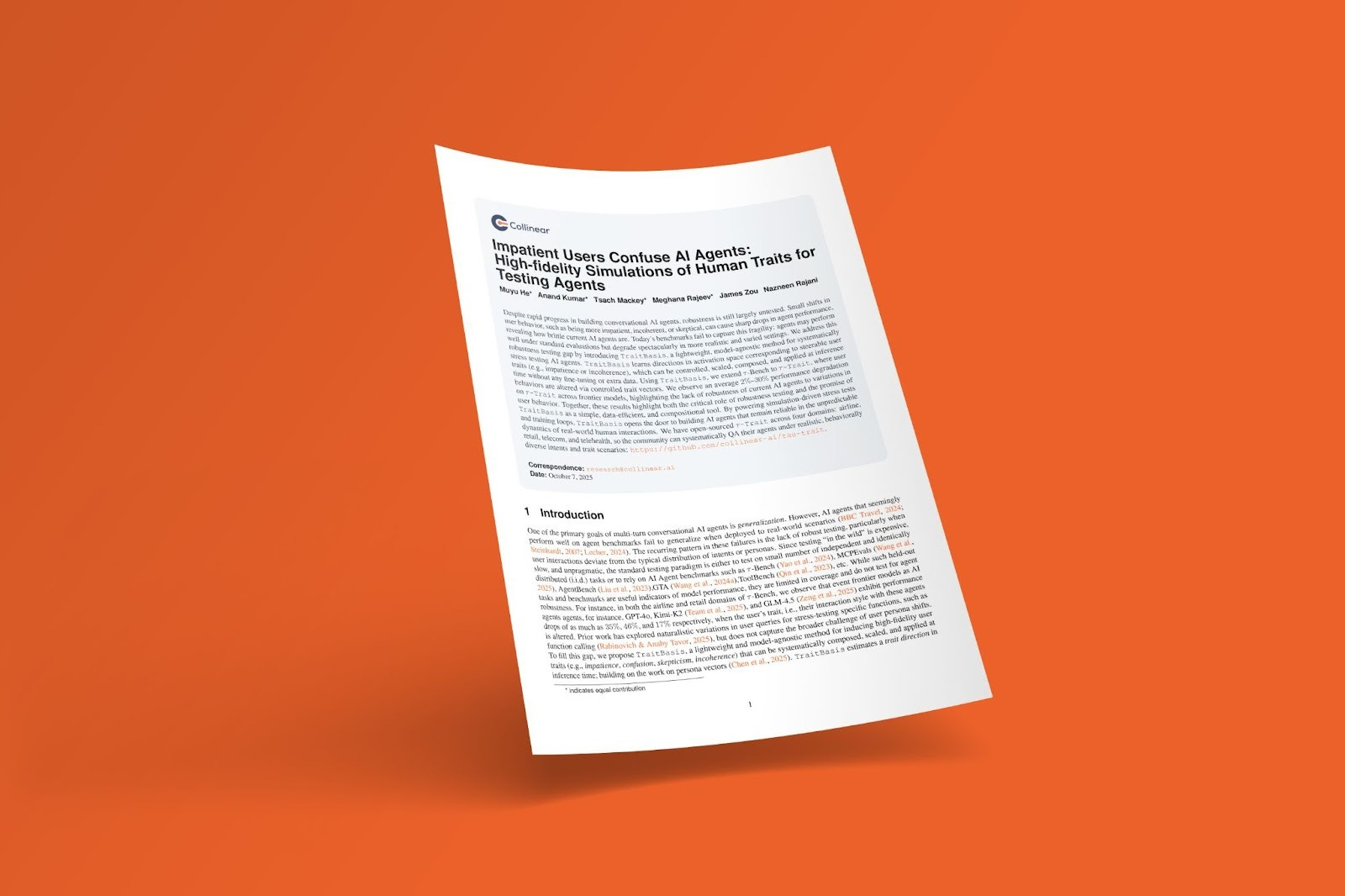 In our most recent Collinear paper, we introduced TraitBasis and τ-Trait, a research-driven approach to doing exactly that — generating high-fidelity, steerable user traits that expose where agents actually break when they interact with your users. When we simulated real human behaviors (impatience, skepticism, confusion, incoherence) on τ-Bench, frontier model success rates dropped by 20%+, underscoring the need for realistic user-simulated data for evals, not more synthetic prompts.