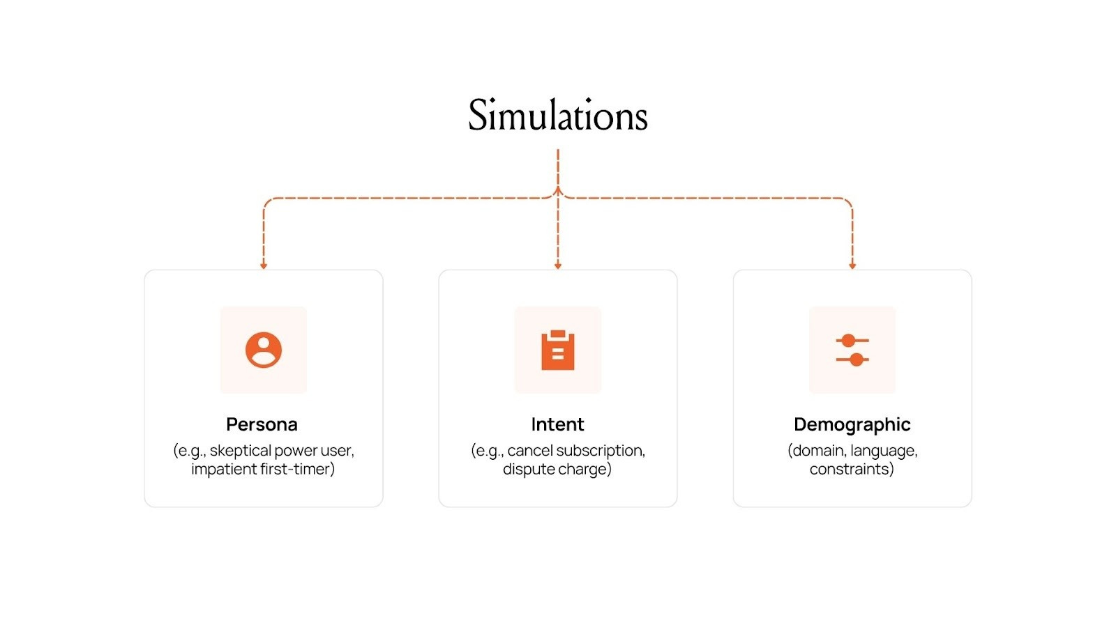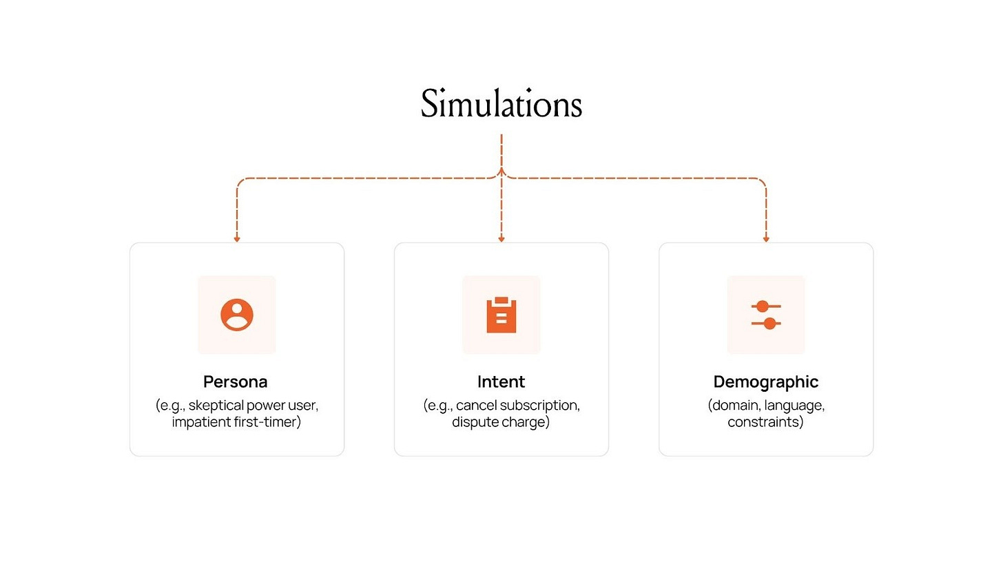 Our simulations aren’t random prompts; they’re structured interactions between your agent and a life-like user with a clear:
